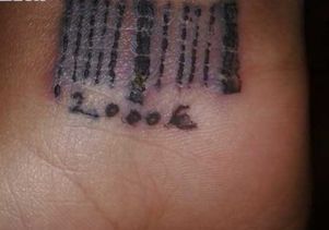Egy prostitúcióba kényszerített, majd a spanyol rendőrség által megmentett nő csuklója. A vonalkód alatti tetoválás az emberkereskedők által a nőtől követelt összeget mutatja.